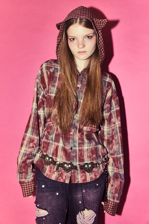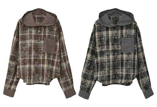 デビルの角付きフードが目をひく、チェック柄シャツ。