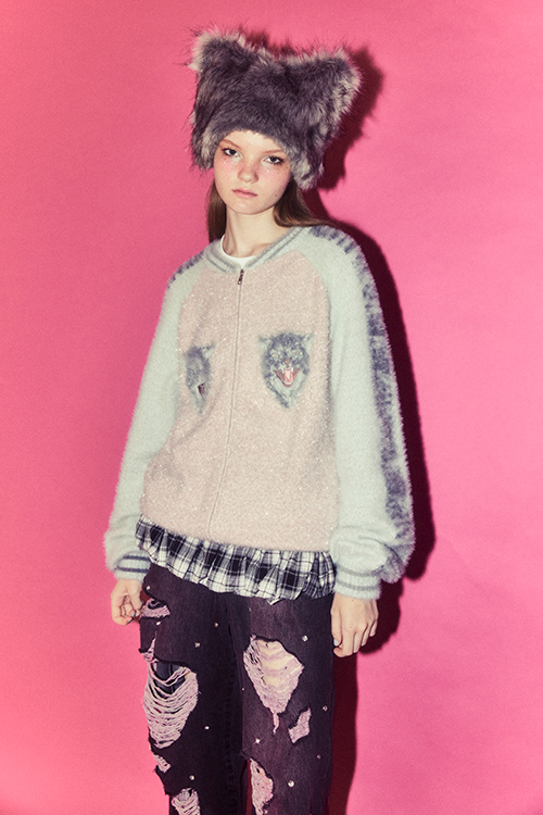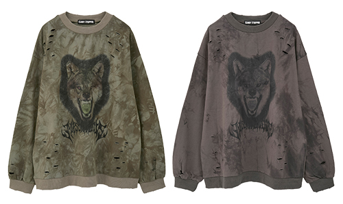 メタル調のロゴとウルフのフォトプリントを組み合わせた